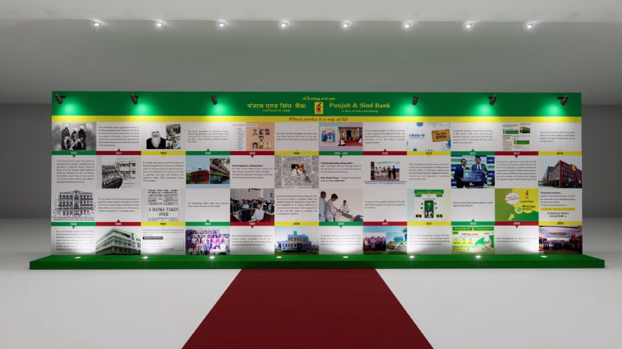 Incorporating the iconic brand colours of Punjab and Sind Bank into our branding, we have carefully designed a storyboard showcasing the bank’s milestones from 1908 to 2023. This storyboard artfully portrays the 115-year history of the bank, emphasizing its enduring legacy.